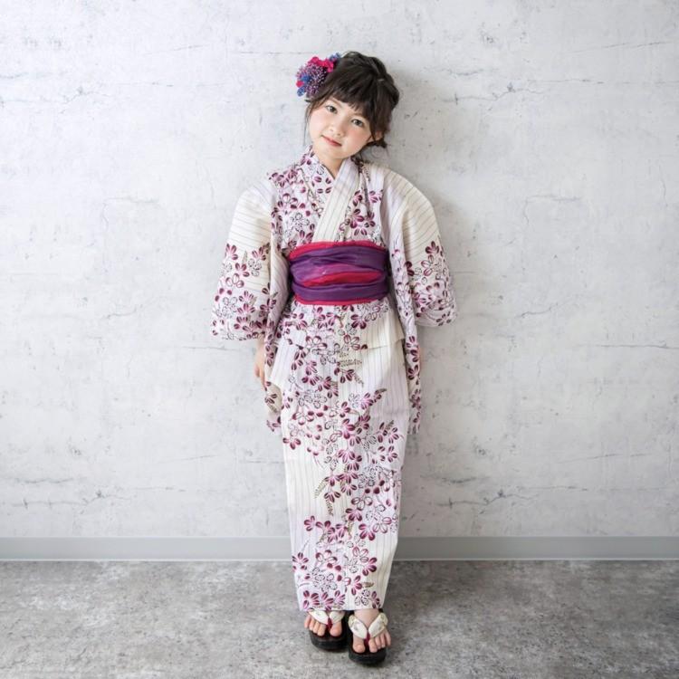 100cm 3 4歳キッズ浴衣 子供ゆかた 女児浴衣 女の子浴衣通販 綿100 白地に横縞梅桔梗 モダンな色使い 即日発送可 品番 17gk H0007 18